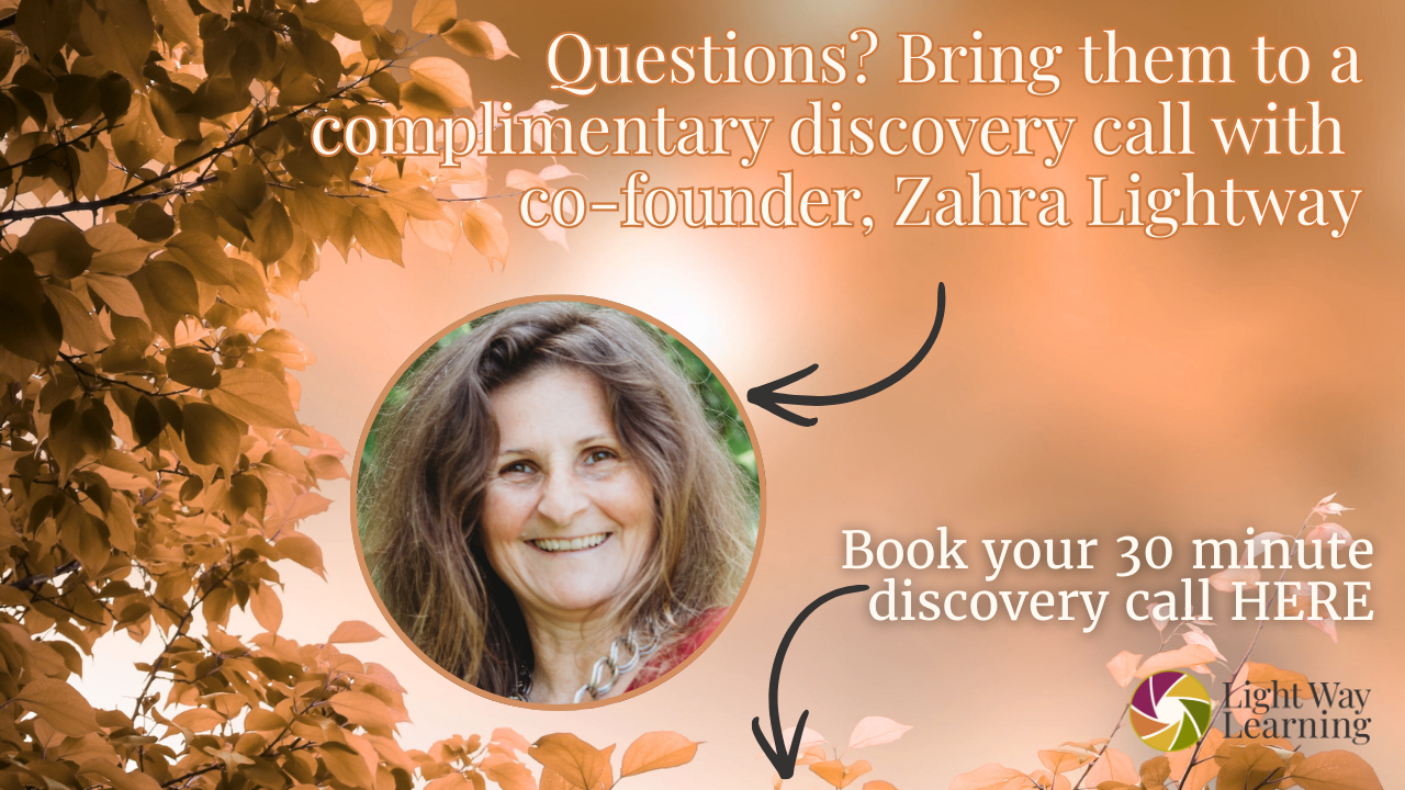 Join small group coaching calls every 3 weeks with certified Light Way Learning coaches. Have time with your accountability partner. Get ready to share a sacred experience & bring your questions, your stuck points, and your wins.